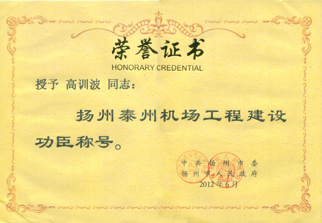 熱烈祝賀高訓(xùn)波同志喜獲“揚(yáng)州泰州機(jī)場(chǎng)建設(shè)功臣”榮譽(yù)稱號(hào)